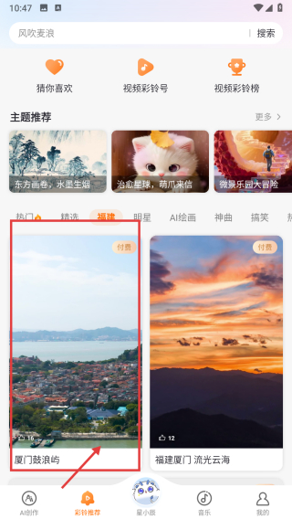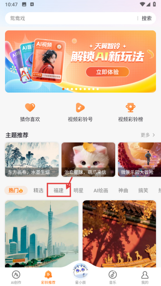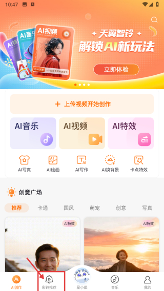 1、打開AI創(chuàng)作類應(yīng)用,點(diǎn)擊底部彩鈴?fù)扑]選項(xiàng),進(jìn)入彩鈴?fù)扑]頁面。