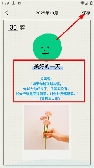 3、在日記編輯頁面,輸入日記內(nèi)容后點擊保存,完成日記記錄操作。