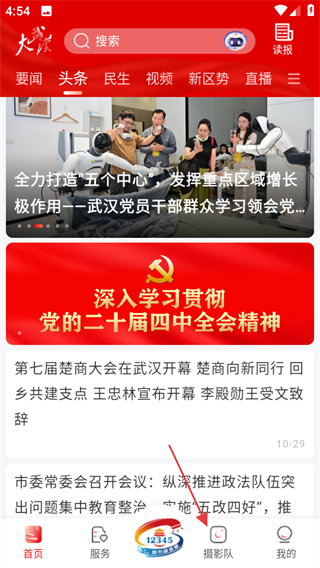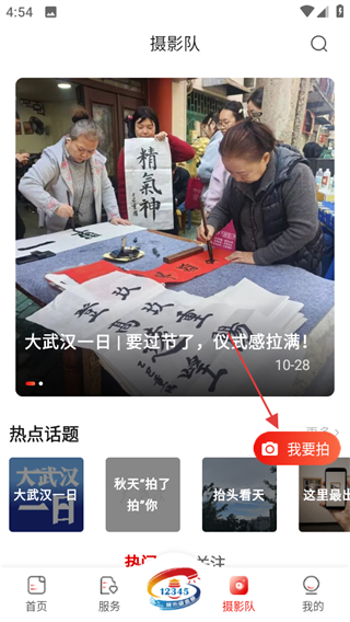 1、打開大武漢,在首頁點(diǎn)擊攝影隊(duì),可進(jìn)入攝影隊(duì)頁面。