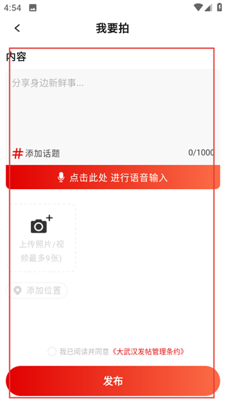 3、在內(nèi)容發(fā)布頁面,填寫內(nèi)容并勾選同意條約后,點(diǎn)擊發(fā)布可發(fā)布帖子。