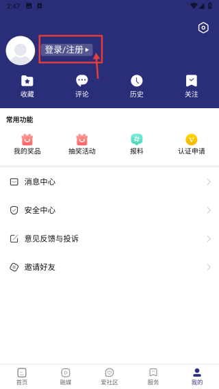 2、在個(gè)人中心頁面,點(diǎn)擊登錄/注冊(cè)選項(xiàng),進(jìn)入登錄頁面。