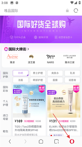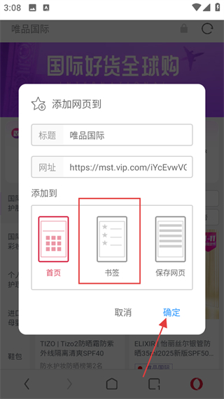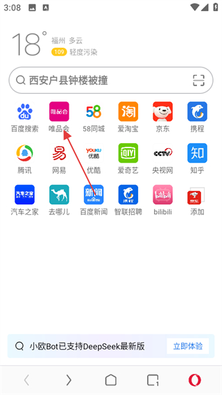 1、打開歐朋瀏覽器,在首頁(yè)點(diǎn)擊唯品會(huì),可進(jìn)入唯品國(guó)際頁(yè)面。