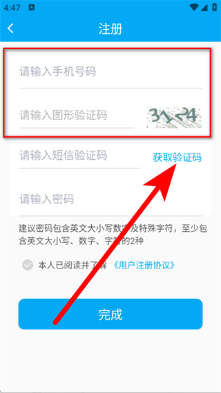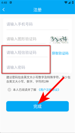 4、輸入短信驗證碼和密碼,點擊完成,完成賬號注冊。