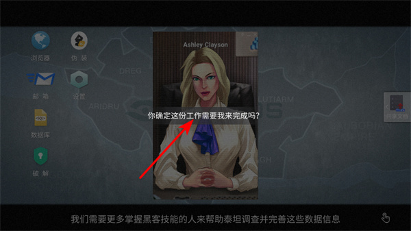 2、在與Ashley Clayson的對(duì)話中,留意劇情提示,明確自身的任務(wù)職責(zé),為后續(xù)開展黑客調(diào)查工作做好準(zhǔn)備。