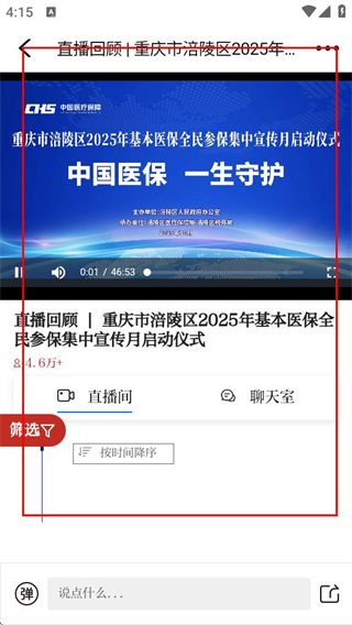 3、在播放頁面可觀看直播回顧內(nèi)容,還可參與聊天室互動。