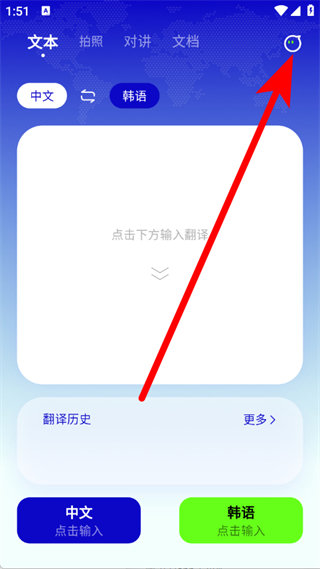 1、打開韓語翻譯器,點(diǎn)擊右上角個(gè)人中心圖標(biāo),進(jìn)入我的頁面。