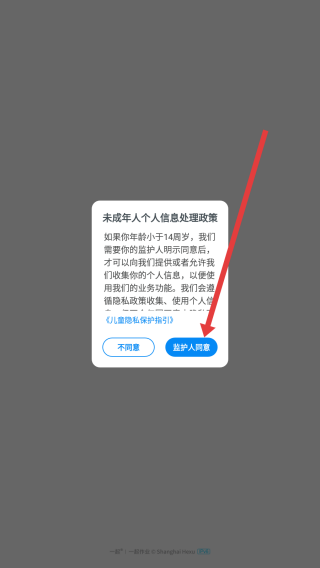 1、面對(duì)未成年人個(gè)人信息處理政策彈窗,通過(guò)點(diǎn)擊監(jiān)護(hù)人同意按鈕,確認(rèn)同意后進(jìn)入應(yīng)用后續(xù)流程。