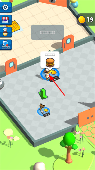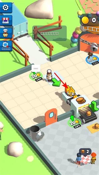 2、點擊箭頭指引的區(qū)域,可解鎖新的功能區(qū)域,擴大店鋪的經(jīng)營規(guī)模,為后續(xù)的漢堡制作、銷售等環(huán)節(jié)提供更多空間和可能。