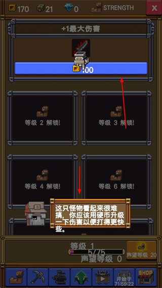 2、升級(jí)裝備,提升最大傷害,更快擊敗怪物,增強(qiáng)戰(zhàn)斗能力。