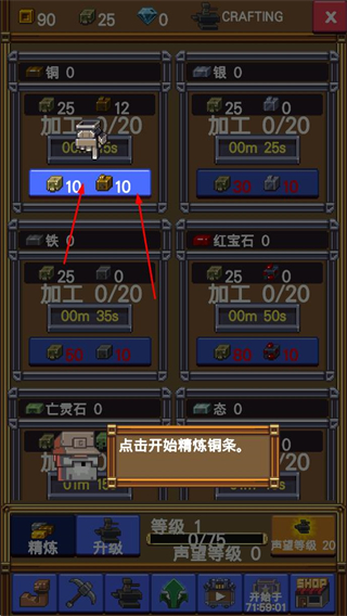 3、進(jìn)入精煉界面,點(diǎn)擊開(kāi)始精煉銅條等資源,積累材料,助力發(fā)展。