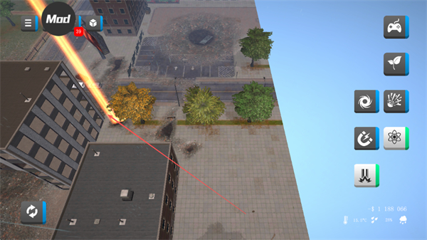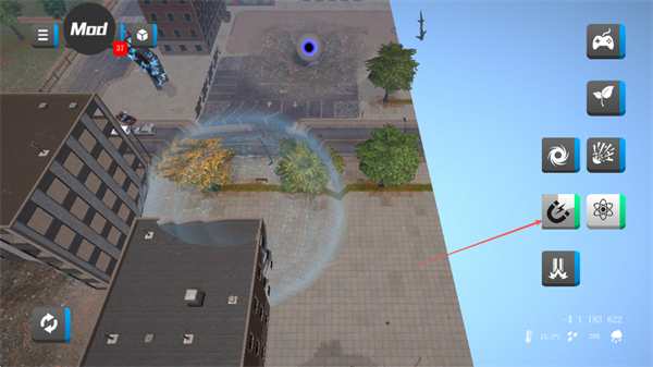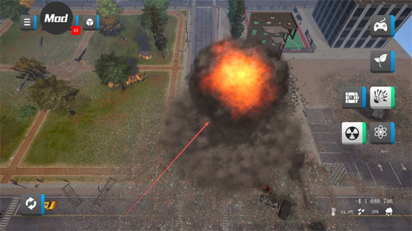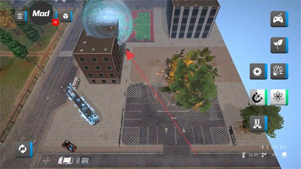 1、選擇右側(cè)的特殊工具如磁鐵、激光等,對城市建筑、植被區(qū)域釋放,制造破壞效果。