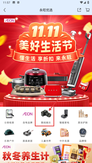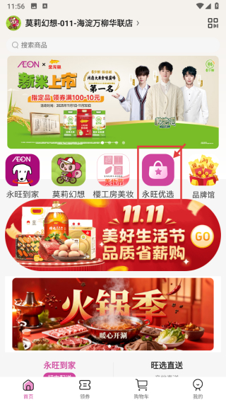1、打開商超類APP首頁,點擊永旺優(yōu)選選項,進(jìn)入優(yōu)選商品板塊頁面。