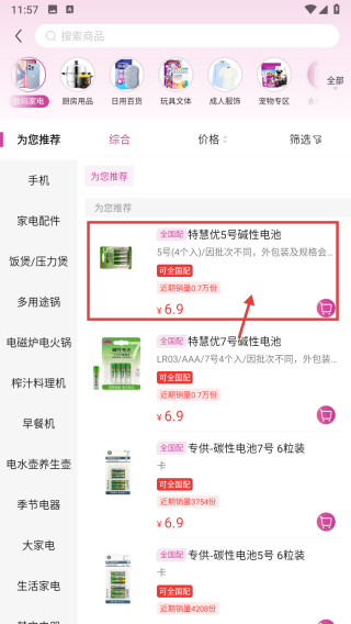 3、在數(shù)碼娛樂商品列表中,點擊特惠優(yōu)5號堿性電池商品條目,進(jìn)入商品詳情頁。