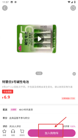 4、在商品詳情頁,點擊加入購物車按鈕,完成商品添加操作。