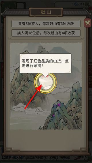1、在趕山界面,發(fā)現(xiàn)紅色品質(zhì)山貨時,點擊進行采摘,紅色品質(zhì)山貨高價值資源,獲取助力發(fā)展。