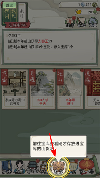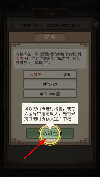 2、點擊放進寶庫按鈕,將山貨存入家族寶庫,這是資源存儲和管理的關(guān)鍵步驟,使用贈送奠定基礎(chǔ)。