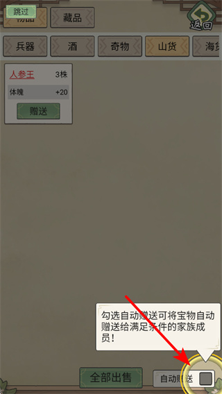 4、在寶庫界面,勾選自動贈送選項,可將寶物自動贈送給滿足條件的家族成員,提升體魄屬性。