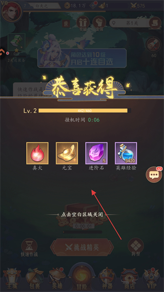 3、利用獲得的資源提升角色等級如從Lv.1到Lv.2,增強戰(zhàn)力。