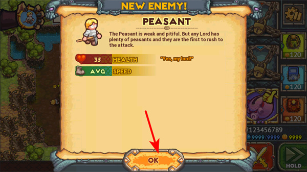2、遇到NEW ENEMY提示時,點擊OK按鈕確認,了解敵人屬性如PEASANT的生命值、速度等,制定防御策略提供依據(jù)。