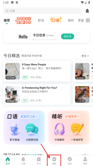 1、打開英語學(xué)習(xí)類APP首頁,點(diǎn)擊底部課程選項(xiàng),進(jìn)入課程頁面。