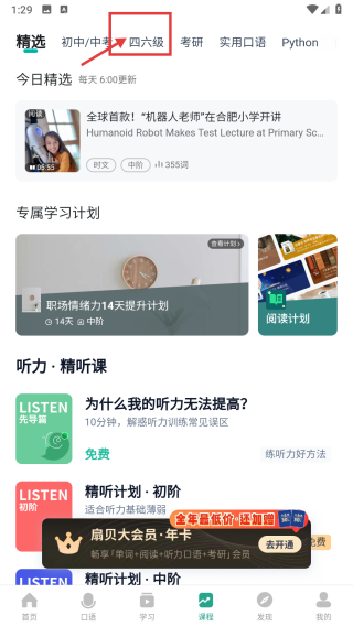2、在課程頁面,點(diǎn)擊四六級(jí)分類標(biāo)簽,進(jìn)入四六級(jí)課程專區(qū)。