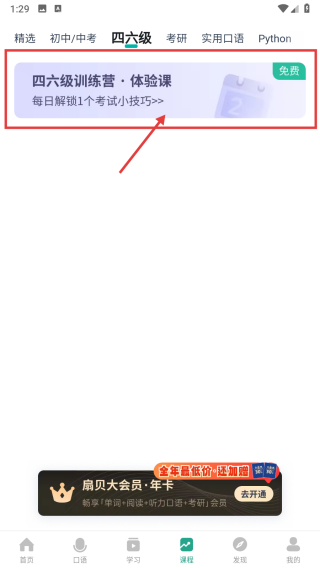 3、在四六級(jí)課程專區(qū),點(diǎn)擊四六級(jí)訓(xùn)練營·體驗(yàn)課條目,進(jìn)入課程詳情頁面。