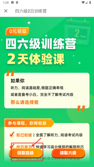 4、在課程詳情頁面,根據(jù)需求點(diǎn)擊領(lǐng)取四級(jí)按鈕,即可獲取對(duì)應(yīng)等級(jí)的訓(xùn)練營課程,開始四級(jí)備考學(xué)習(xí)。