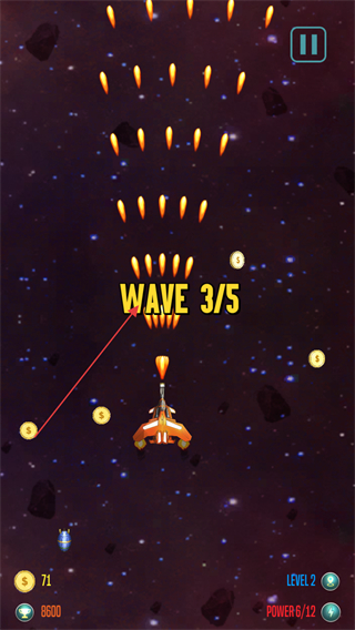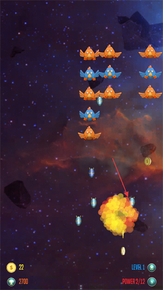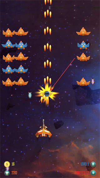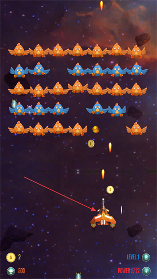 1、通過(guò)滑動(dòng)屏幕空白區(qū)域控制飛機(jī)左右上下移動(dòng),躲避小雞發(fā)射的導(dǎo)彈并攻擊他們。