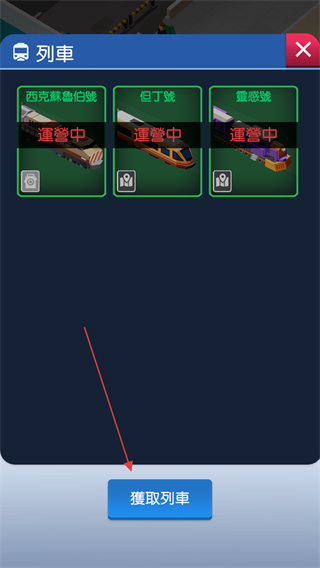 1、通過(guò)查看列表查看擁有的火車信息,點(diǎn)擊獲取列車可以花費(fèi)鉆石購(gòu)買新的列車。