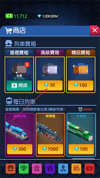 2、在商店中可以通過(guò)抽取列車寶箱用少量的鉆石看運(yùn)氣獲取優(yōu)質(zhì)的火車,或直接花費(fèi)鉆石購(gòu)買。