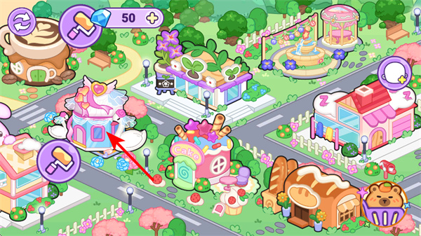 1、在游戲中,點擊主題建筑,場景進行裝飾和互動,開啟趣味裝扮玩法的關鍵操作,解鎖角色裝扮、場景內(nèi)容。