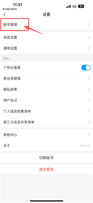 3、在設(shè)置頁(yè)面,點(diǎn)擊賬號(hào)管理選項(xiàng),進(jìn)入賬號(hào)管理頁(yè)面。