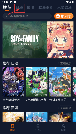 1、打開動(dòng)漫類APP首頁,點(diǎn)擊頂部日漫板塊,進(jìn)入日漫頁面。