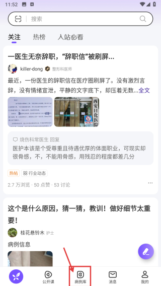 1、打開醫(yī)療類APP首頁(yè),點(diǎn)擊底部病例庫(kù)選項(xiàng),進(jìn)入病例庫(kù)頁(yè)面。