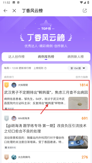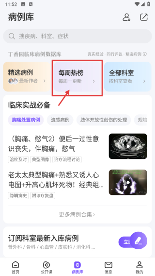 2、在病例庫(kù)頁(yè)面,點(diǎn)擊每周熱榜板塊,進(jìn)入丁香風(fēng)云榜的病例庫(kù)熱榜頁(yè)面。
