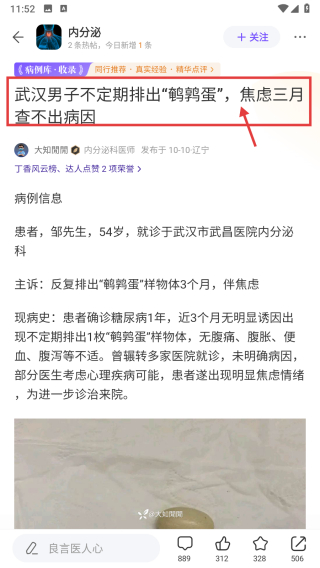 3、在病例庫(kù)熱榜頁(yè)面,點(diǎn)擊武漢男子不定期排出鵪鶉蛋,焦慮三月查不出病因病例條目,進(jìn)入病例詳情頁(yè)面。