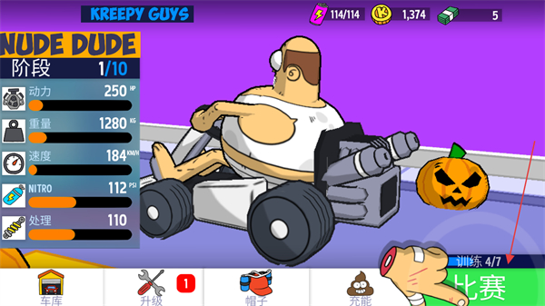 1、打開游戲在主頁可以進行車輛升級與角色換裝,點擊右下角比賽可以快速開始比賽。