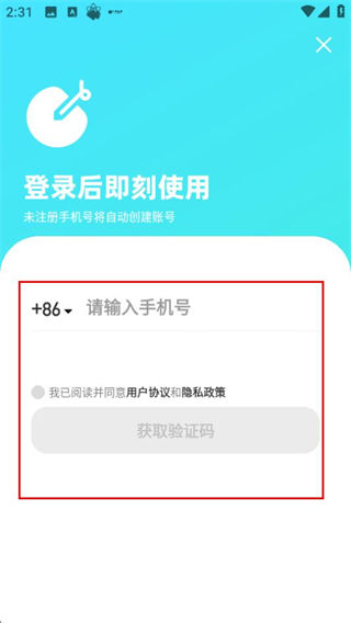 3、在登錄界面,輸入手機號并勾選協(xié)議后,點擊獲取驗證碼。