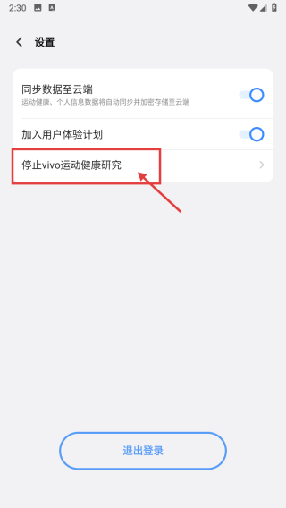 3、在設(shè)置頁(yè)面,點(diǎn)擊停止vivo運(yùn)動(dòng)健康研究選項(xiàng),彈出確認(rèn)框。