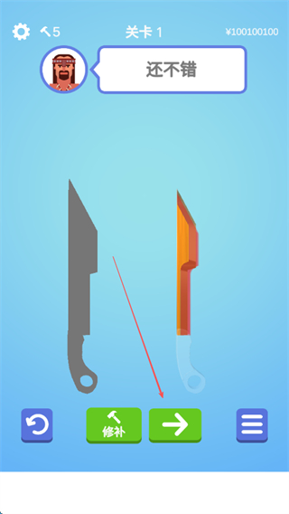 4、打磨完成后,若獲得還不錯(cuò)的評(píng)價(jià),可點(diǎn)擊箭頭按鈕進(jìn)入下一關(guān),或選擇修補(bǔ)進(jìn)一步優(yōu)化。