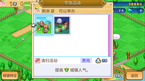 1、在菜單內(nèi)可以通過(guò)花費(fèi)城鎮(zhèn)點(diǎn)數(shù),選擇想要舉辦的城鎮(zhèn)活動(dòng)。