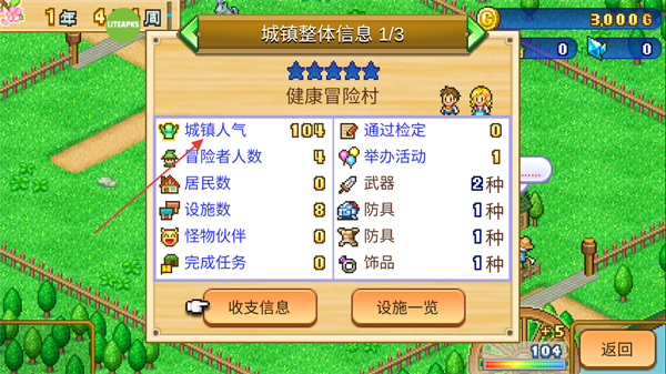 4、在城鎮(zhèn)整體信息菜單中,可以看到當(dāng)前的城鎮(zhèn)人氣和收支信息。