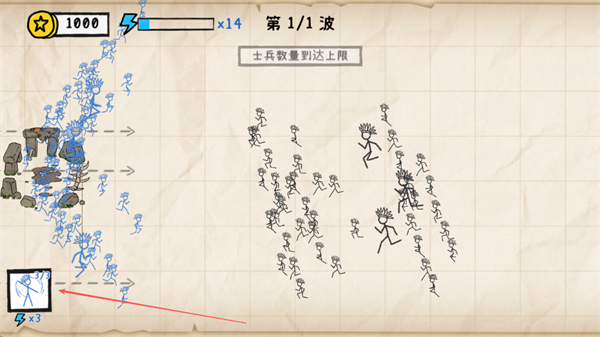1、點(diǎn)擊左下角士兵圖標(biāo),派遣藍(lán)色士兵出戰(zhàn),注意士兵數(shù)量上限,合理派遣。