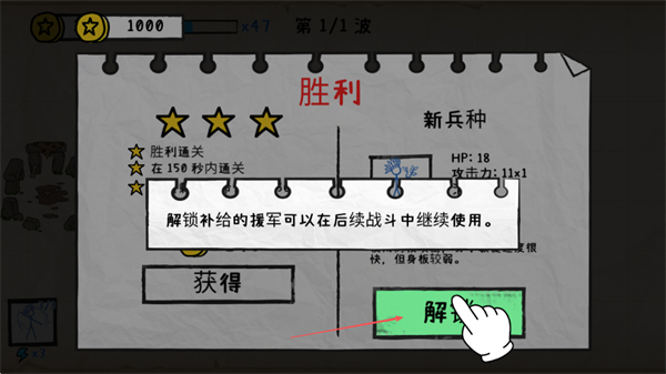 4、戰(zhàn)斗勝利后,點(diǎn)擊解鎖按鈕,開(kāi)啟新兵種,后續(xù)戰(zhàn)斗可繼續(xù)使用解鎖的援軍。