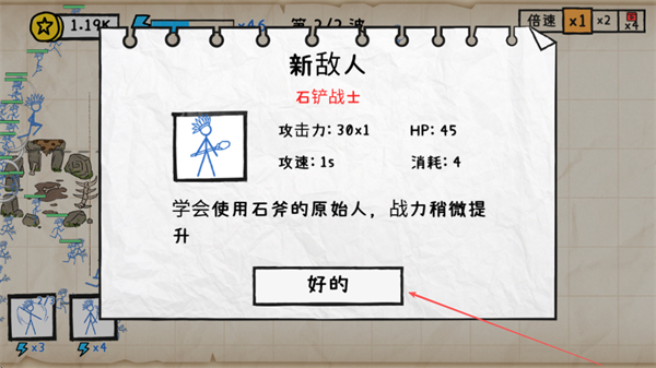 2、遇到新敵人石鏟戰(zhàn)士時(shí),點(diǎn)擊好的了解其屬性,調(diào)整作戰(zhàn)策略。