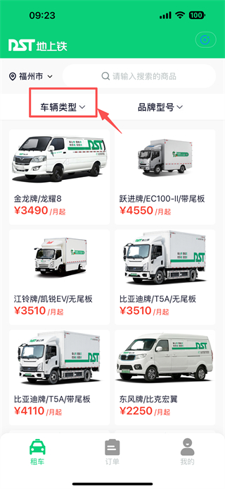 2、在租車(chē)頁(yè)面,點(diǎn)擊車(chē)輛類(lèi)型選項(xiàng),進(jìn)入車(chē)輛類(lèi)型選擇頁(yè)面。