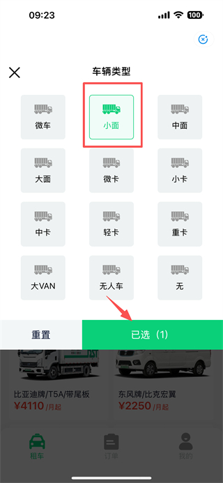 3、在車(chē)輛類(lèi)型選擇頁(yè)面,點(diǎn)擊小面類(lèi)型,點(diǎn)擊已選(1)確認(rèn)選擇。