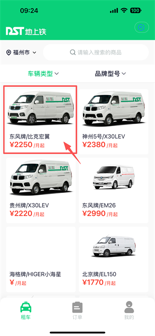 4、確認(rèn)選擇后,即可查看小面類(lèi)型的車(chē)輛列表,如東風(fēng)牌/比克宏翼等車(chē)型的租賃信息。
