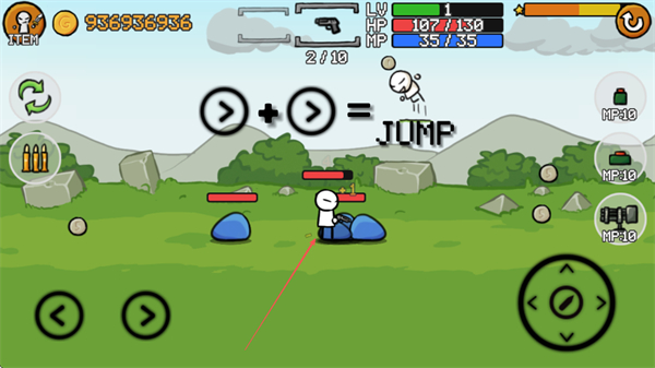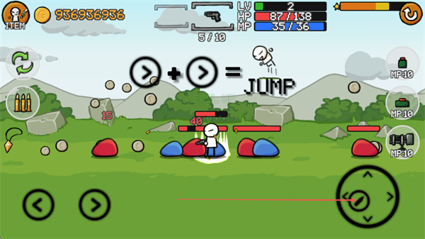 1、操控火柴人移動(dòng),雙擊右方向鍵可跳躍,攻擊藍(lán)色敵人,收集道具和金幣。