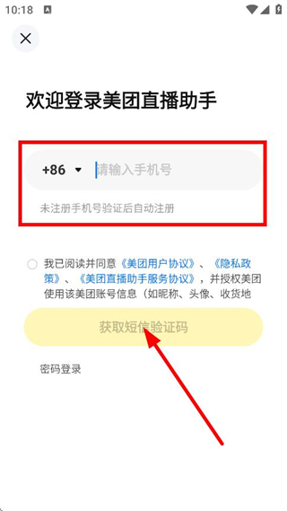 3、在手機(jī)號(hào)登錄頁面,輸入手機(jī)號(hào),點(diǎn)擊獲取短信驗(yàn)證碼。